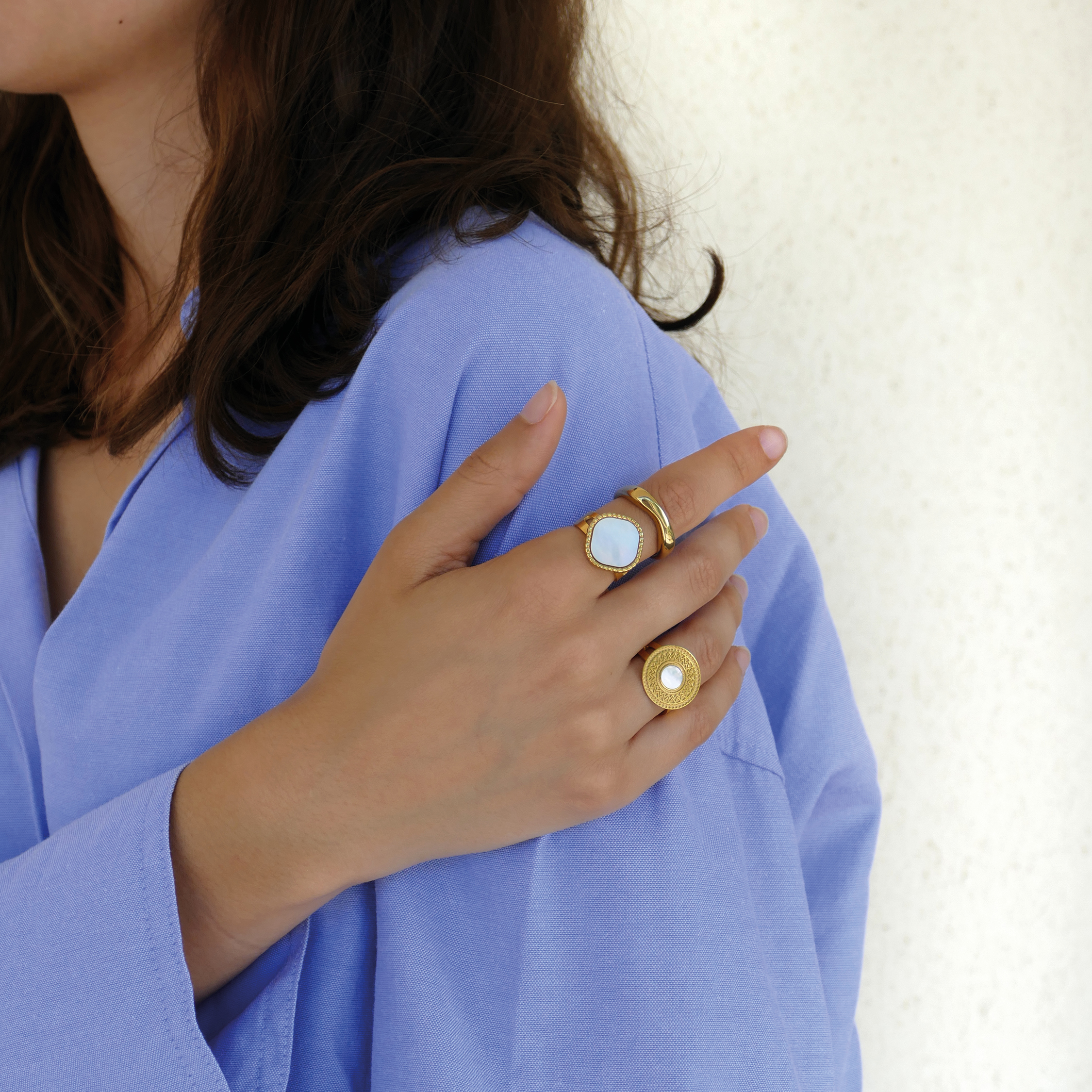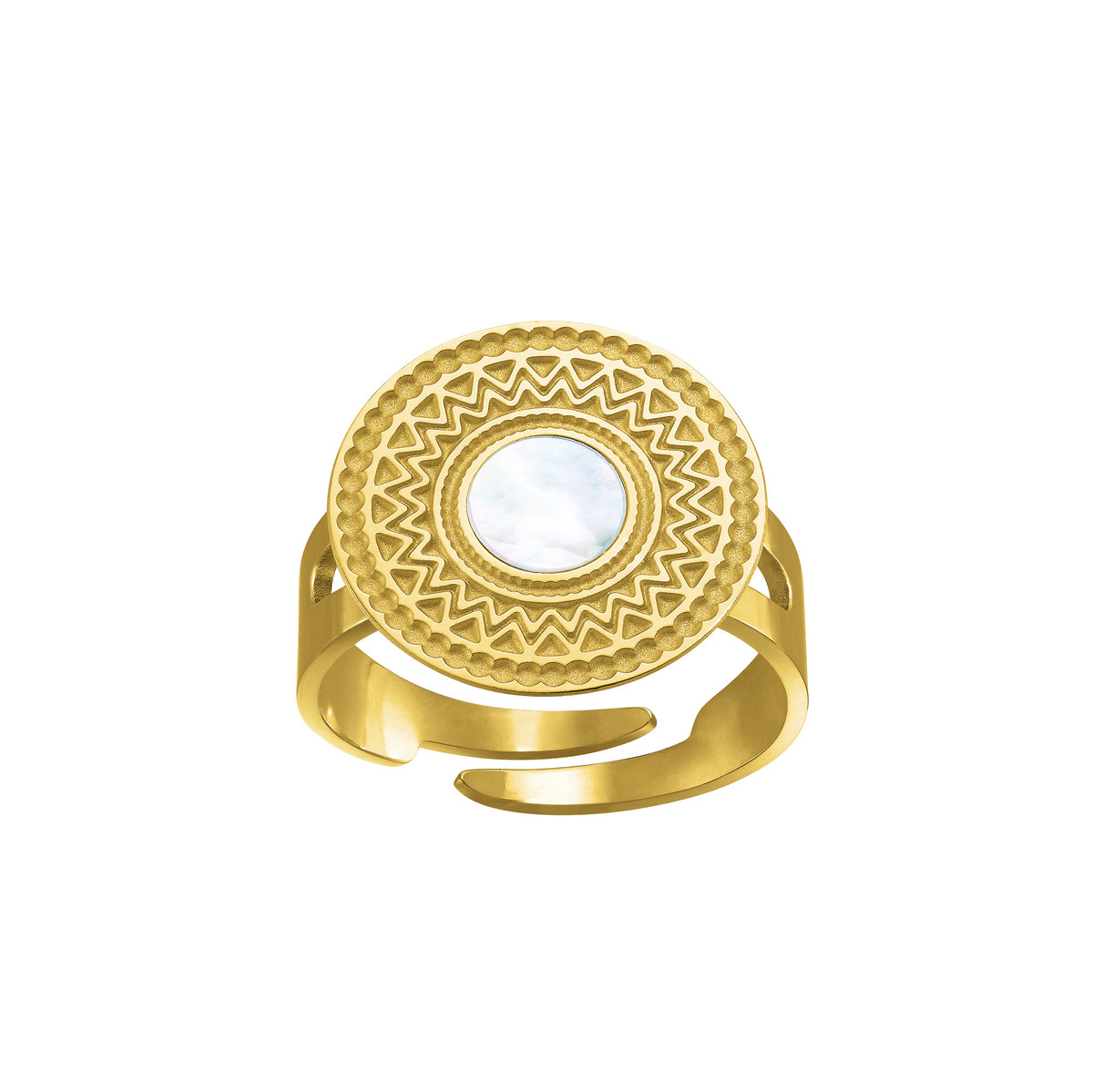 Bague ajustable en acier doré 316L avec nacre véritable au centre.