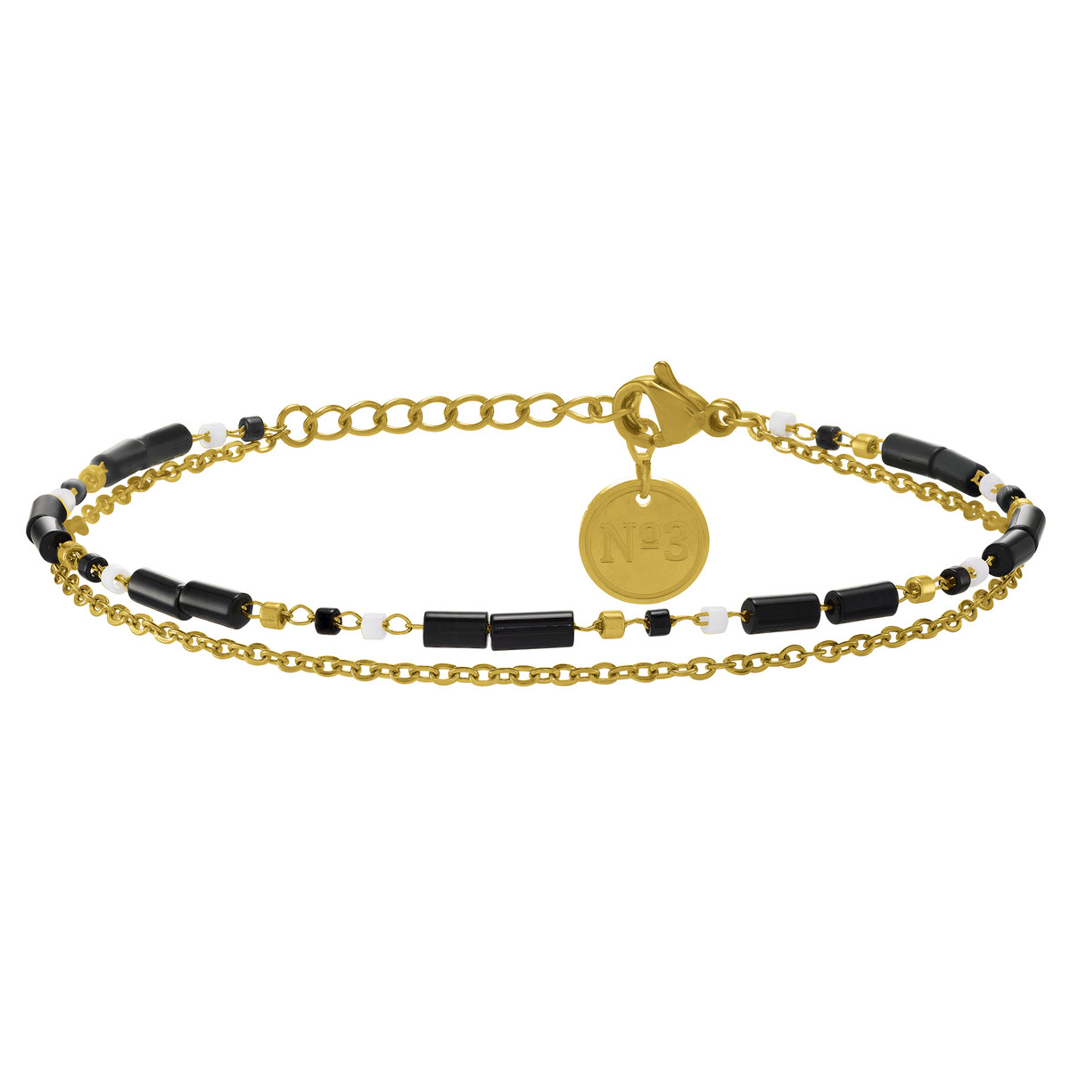 Bracelet ajustable en acier doré 316L double rangs dont un avec des perles Miyuki noires et blanches