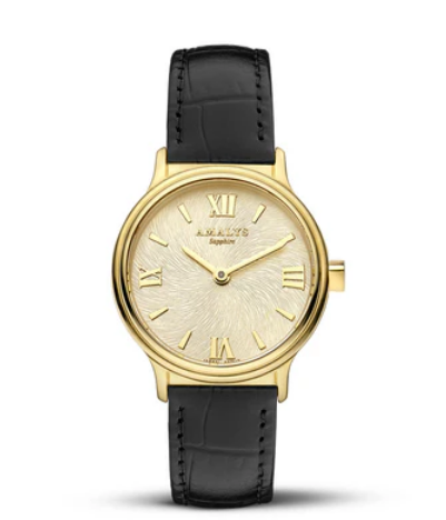 Avec cette belle harmonie de noir et doré, cette montre se porte en toute élégance et style.